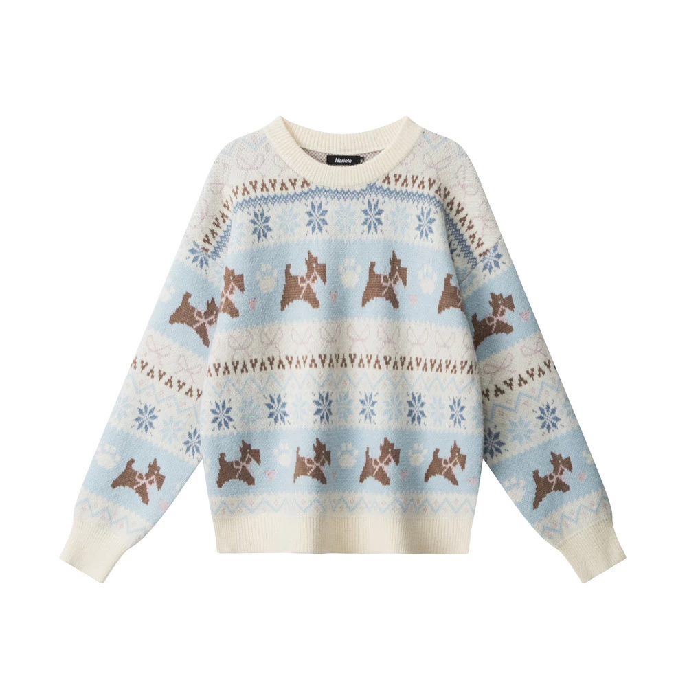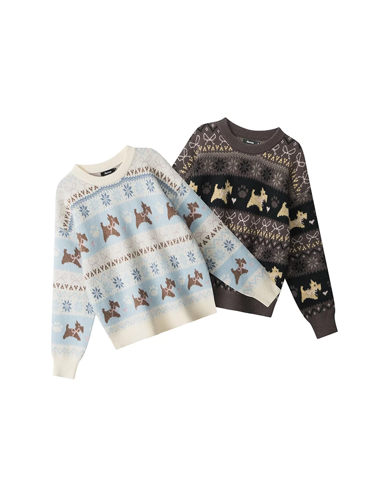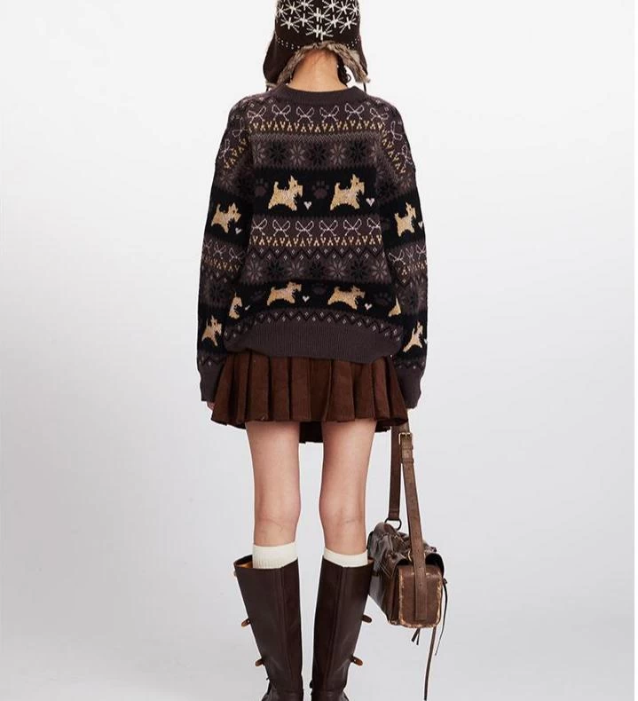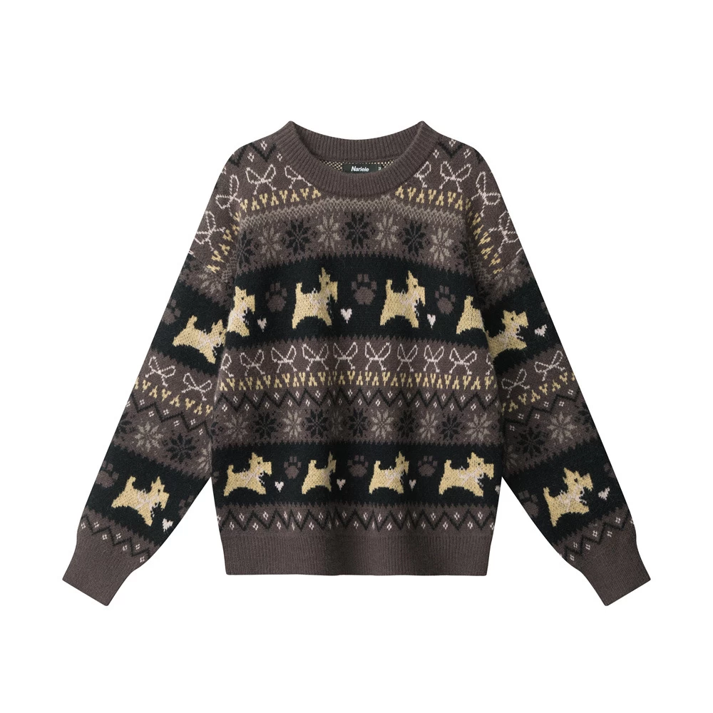 This vintage Fair Isle sweater features a dark brown and black base, woven with playful Scottish Terrier patterns, paired with elements like paw prints, snowflakes and bows, exuding a retro yet lovely vibe.