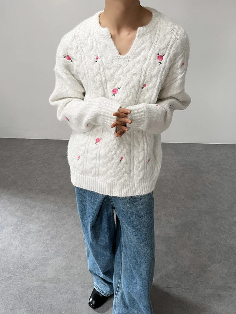 This white embroidered sweater features a plush cable-knit texture that is soft and skin-friendly, exuding a cozy and relaxed vibe.Scattered pink rose embroidery adorns the garment, with sweet elements balancing out the thickness of the knit for a delicate yet understated look. The small V-neck cut enhances neck lines, and the relaxed fit flatters all body types.